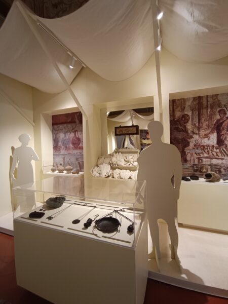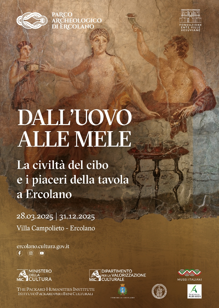 The first exhibition ever entirely devoted to ancient “Roman” food, Ab ovo usque ad mala is the third and final exhibition about the finds of Herculaneum. The first in 2018, “SplendOri. Il lusso negli ornamenti a Ercolano” concerned the valuable artifacts: jewellery: necklaces, rings, earrings, coins and precious oil lamps and was displayed in the Site’s Museum, where they remain today. The second, “Materia”. Il legno che non bruciò a Ercolano”( “Materials: The Woods that Didn’t Burn up at Herculaneum”), now also on display in the Site’s Museum, concerned wooden, cloth, and other organic objects like food, preserved in tact because of lack of oxygen. On display were furniture, frames, architraves, doors, one of which is a unique folding one, and a boat. This present exhibition aims to feature kitchen utensils and the large amount and variety of food emphasizing the high quality of these finds at Herculaneum, thus the foods, their preparation, and the table ware.