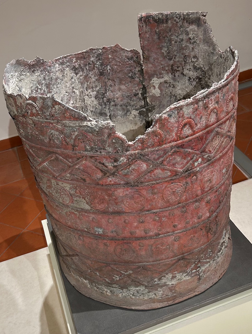 At first the grains were home-ground, often coarsely, in millstones and home-baked. Sometimes the dough of the round loaves had incisions (usually eight) to facilitate slicing after baking. Later bakeries produced both bread and cakes; some even baked their clients’ bread, the dough being initialized for later ownership recognition, a practice still not uncommon in southern Italy. In addition to carbonized grains and bread on display here are millstones, primitive hand-turned mixers for home baking and later more sophisticated professional ones, brick and tile dome-shaped ovens, and bronze or terracotta, often round, baking dishes and trays. Needless to say, many of these baking utensils are similar to today’s.
